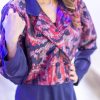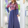 A navy blue abaya with a brocade cropped bodice and sleeves. The brocade bodice resembles a jacket with a collar and covered button detail. This abaya has an open front.