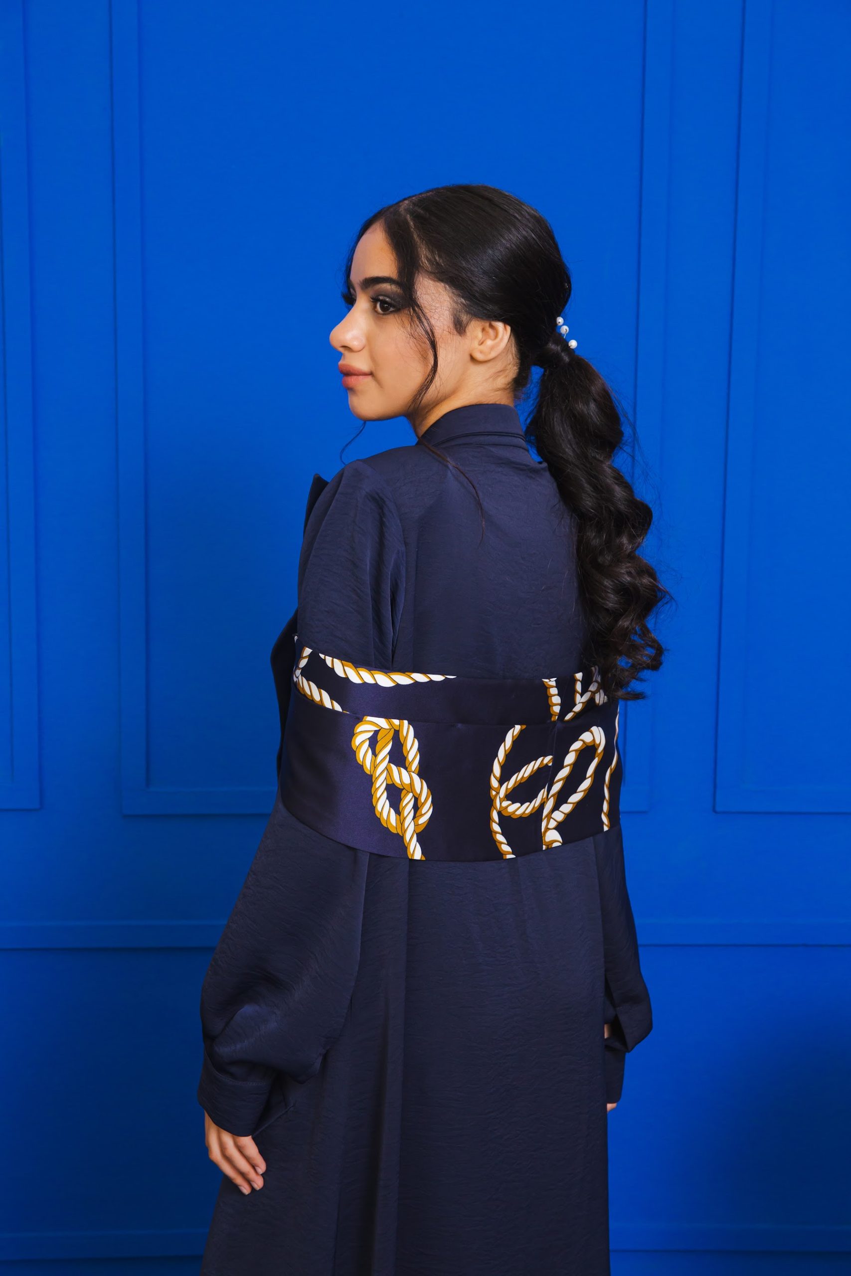 A Navy abaya with printed shawl Detail. The shawl is floor length and adjustable.