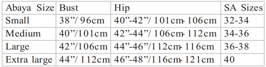 Abayas are designed to be of loose fit and should be 2-4” larger in size than actual body measurements. The table below shows the measurements of the Abaya (not actual body measurements).